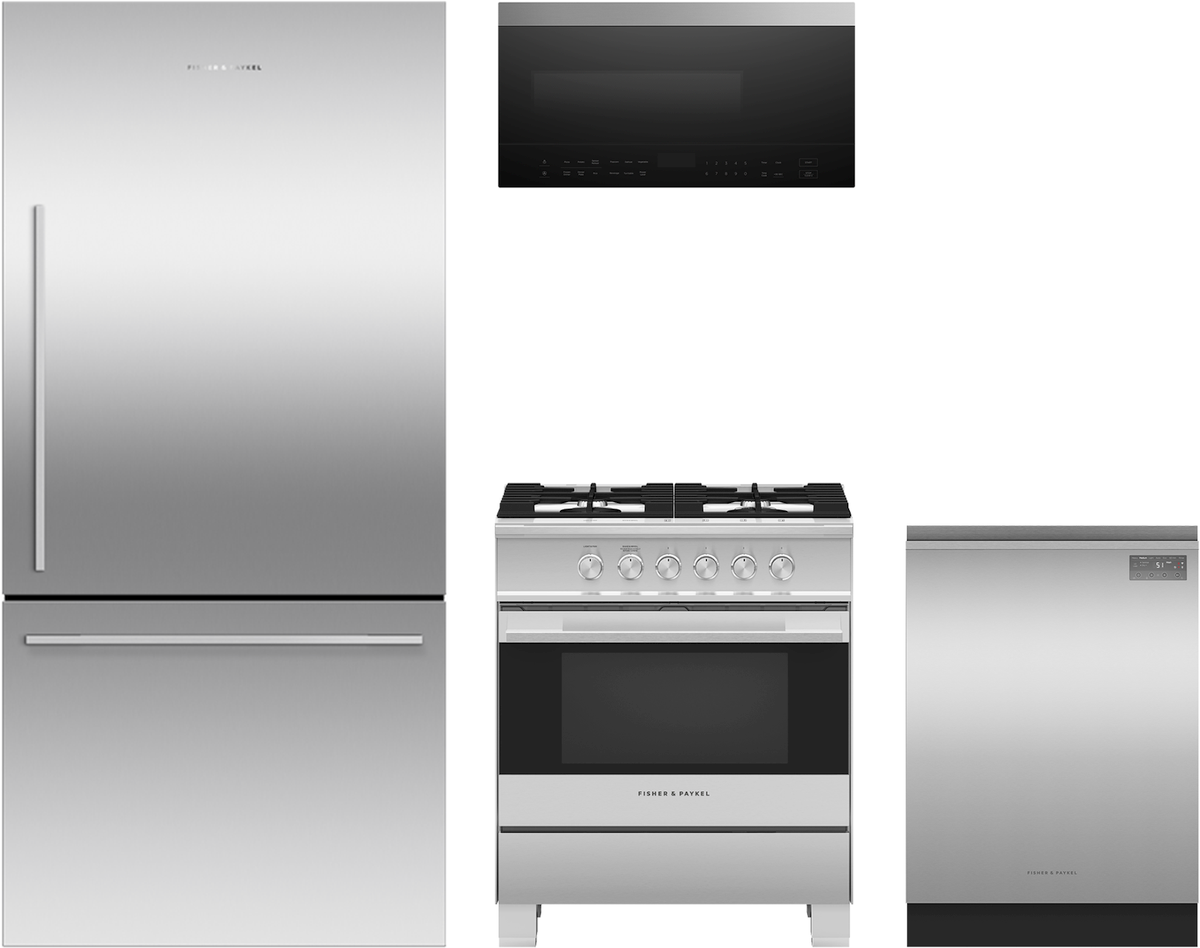 Fisher & Paykel 4 Piece Kitchen Appliance Package with a bottom freezer refrigerator, pro style gas range, drawer dishwasher and over the range microwave.Read More