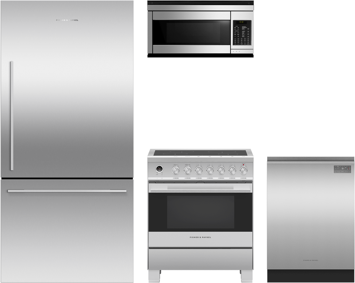 Fisher & Paykel 4 Piece Kitchen Appliance Package with a bottom freezer refrigerator, pro style induction range, drawer dishwasher and over the range microwave.Read More