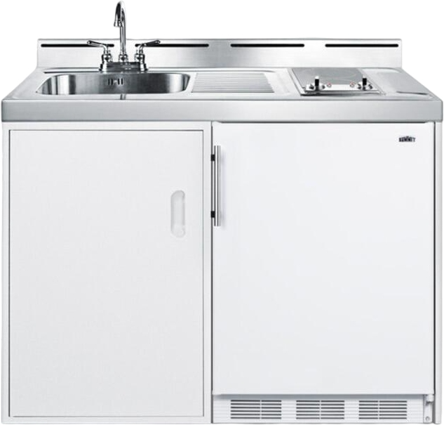 The C48ELGLASS1P 48" All-In-One Kitchenette from Summit comes with 2-Burner 115V Smoothtop Cooktop, 5.1 cu. ft. Refrigerator-Freezer, Sink & Faucet, and Storage Cabinet. Available at AppliancesConnection