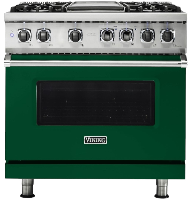 The Viking® Ivy 36" Self Cleaning Dual Fuel Range combines luxury and performance. Featuring a spacious gas cooktop, an self-cleaning oven, and a built-in griddle, it offers precise cooking control and a stylish finish for any kitchen.Read More