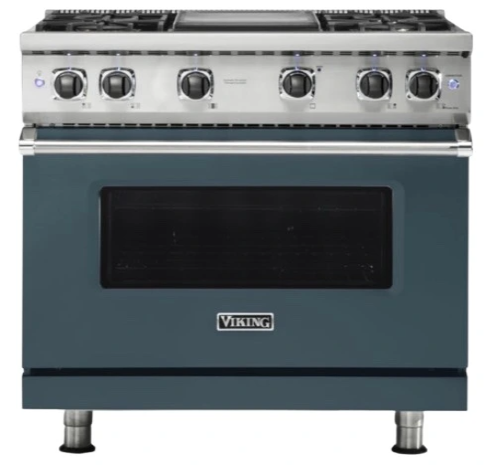 The Viking® 5 Series 36" Squall 6-Burner Gas Sealed Range is a perfect choice for those who want a stylish, high-performing cooking appliance. The Squall finish adds a modern flair to your kitchen, while the 6 burners, large convection oven, and self-cleaning features offer professional-grade cooking performance.Read More